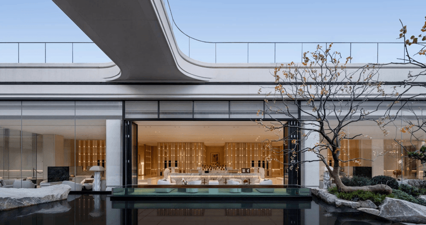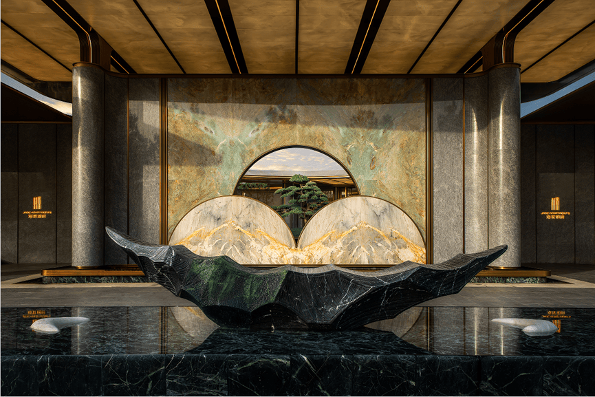 项目位于西安的城市中轴南段、曲江新区核心段。华发股份凭借在地文化的深度理解与创新表达,将盛唐气韵与现代美学相融合。汇聚GOA张晓晓、JTL刘展、SLD梁志天、奥迪室内设计杜康生等国际一线设计资源,以超越标准化的定制开发模式,彰显对高端人居需求的深刻洞察。建筑立面以“五彩鎏金”为主题,采用五种金色系材质组合;下沉庭院以“天光云影”为主题,采用浅水浮岛设计,配备悬挑式游艇挂瀑与百万级镜面水廊;户型设计对标全国顶豪产品,历经十几轮推敲,产品功能实现全面越级。
