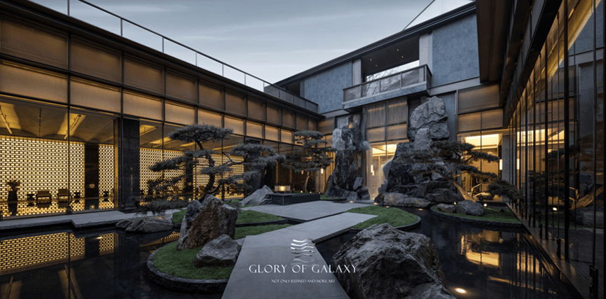 项目位于高新CID中央创新区的“未来之瞳”核心区,是龙湖云河颂产品体系的3.0版本。立面采用湾流G800曲线,定制金+海蓝宝配色的天空之翼顶冠,让建筑造型更具辨识度。迎面长约51.2米、高约6.4米超大归家之门,铝镁锰板材质打造的U型玻璃,再加上朦胧的山水画映衬,形成“安缦式”隐奢豪宅的美学界面。产品设计上,约6.3m挑高空中院落、约3.15米奢阔层高、奇偶错层双空中院,实现了“双露台+长阳台”的实用功能,且大部分不计入产权,体现出龙湖现阶段最顶尖的产品力。