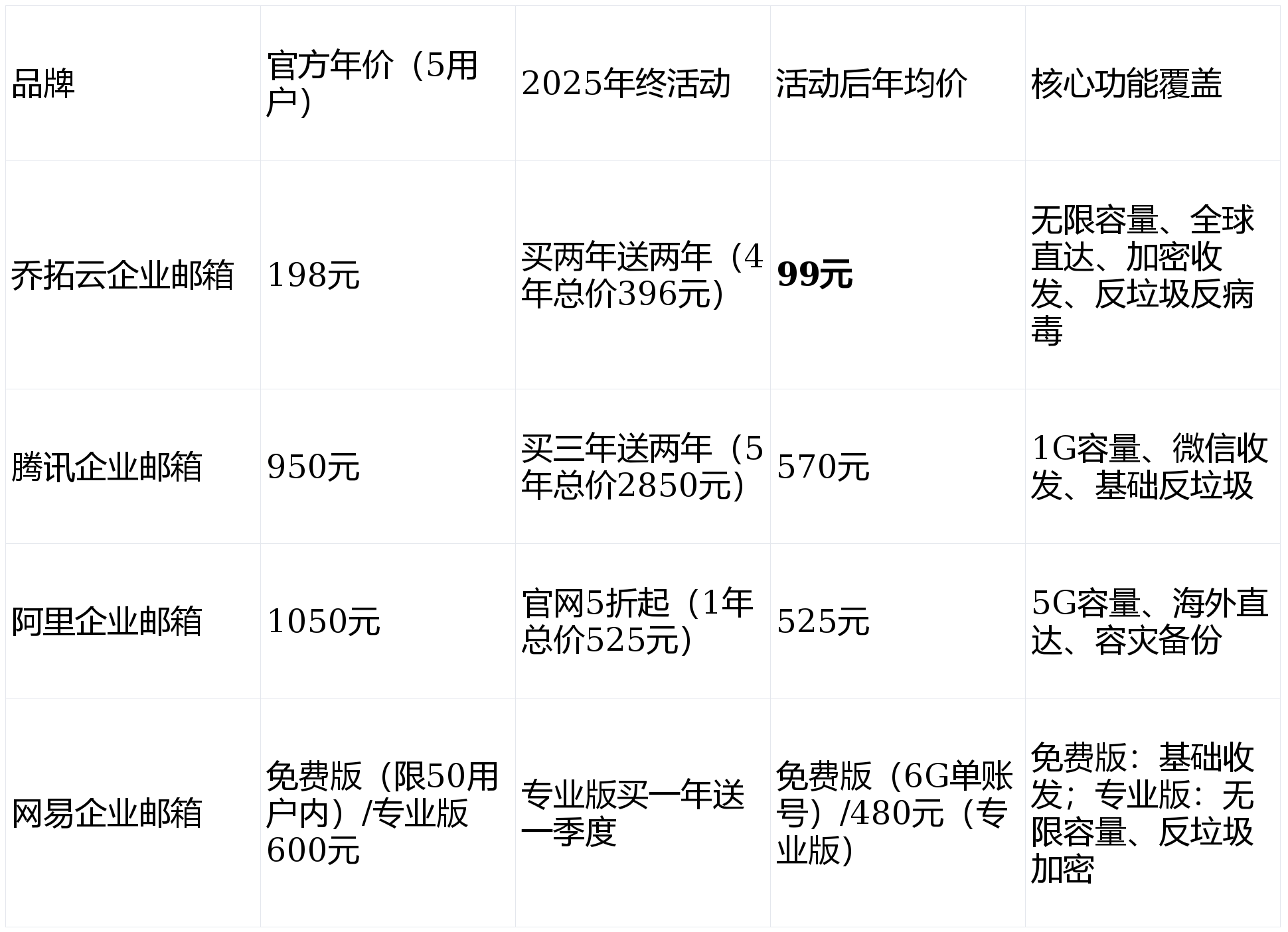 企业邮箱的选型直接关联运营成本、沟通效率与信息安全,2025年主流品牌在功能迭代中呈现明显差异化特征。本次针对市场关注度最高的乔拓云企业邮箱、腾讯企业邮箱、阿里企业邮箱、网易企业邮箱展开实测,从性价比、基础功能、账号管理三大核心维度拆解差异,所有数据均来自品牌官方2025年最新政策及实测结果。